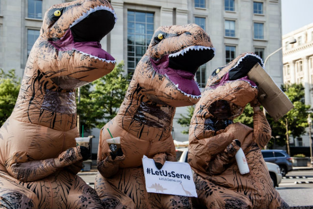 First the life-size squirrels came out to tell Republicans that a proposed healthcare provision was “nuts.” Now, people dressed as dinosaurs rising from the long dead are warning against the extinction of the Corporation of National and Community Service, which funds tens of thousands of Americorps positions each year.