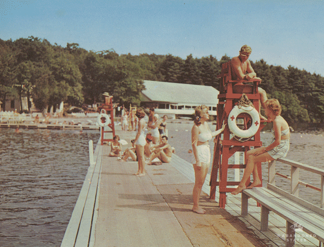 Postcard caption: “Birchwood is the only resort offering three swimming pool facilities, indoor pool, outdoor pool and lake with beach. Pictured here is beautiful Eagle Lake, at the foot of the Village Green. Here couples enjoy the white-sand beach, chaise lounges, bicycle and row boats, and fish off its shores … Six low-cost all-expense package plans include indoor swimming, airplane rides, movies, bowling, horseback riding, all winter sports and 40 other free activities!” More recently, the hangar at the resort’s airstrip served a different purpose: cop killer Eric Frein made the place his home during a weeks-long manhunt and was eventually apprehended just a stone’s throw from Eagle Lake. (Photograph by Pablo Iglesias Maurer, postcard published by Planned Color Post Cards)
