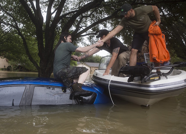 Matthew Koser, hypothermic and shaking, is rescued from atop his car after looking for important papers and heirlooms inside his grandfather’s house after it was flooded by heavy rains from Hurricane Harvey August 29, 2017 in the Bear Creek neighborhood of west Houston, Texas. (Photo by Erich Schlegel/Getty Images)