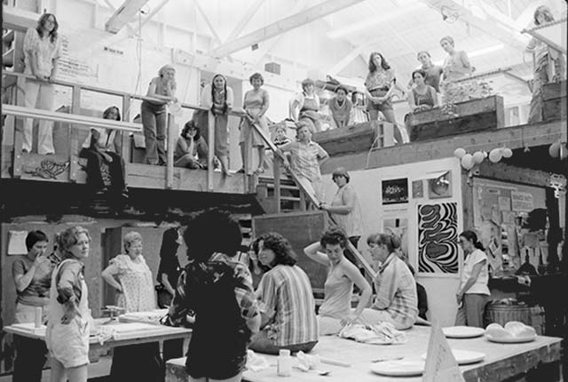Judy Chicago addresses a gathering of volunteers in the Dinner Party studio, ca. 1978. (Amy Meadow/NMWA)