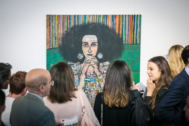 In Lebanese artist Zena Assi’s colorful portrait Al Kouwa Fi Yad El Mar2a (The Force is in the Hands of the Woman), the subject stares directly into the viewer’s eyes. Her garment is collaged with images, political symbols, and symbols of commerce. The collage is peppered with words and labels that can be read as inspirations or even threats, depending on interpretation.