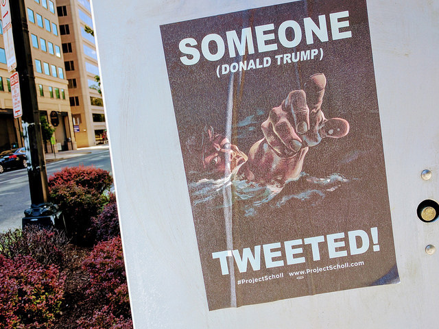 The posters, designed by artist Robert Russell, were put up over the weekend with the help of PR Group Movement Media, beginning with a smaller batch on Saturday and the rest on Sunday. There are seven versions in the current batch, which have been hung near the Trump hotel, on Georgia Ave., in Columbia Heights, by Capitol Hill, and elsewhere.