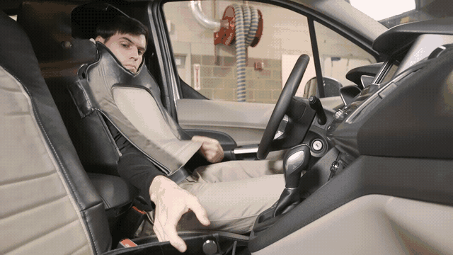 Man puts on his “seat suit.” (Image courtesy of Ford)