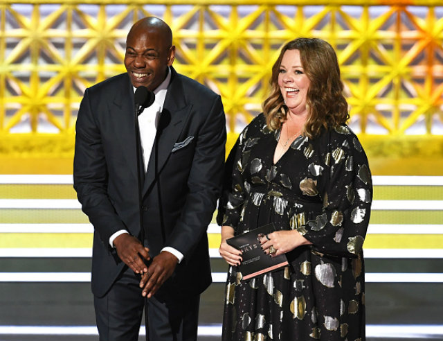 Dave Chappelle alongside Melissa McCarthy speaking onstage during the 69th Annual Primetime Emmy Awards on September 17. (Photo by Kevin Winter/Getty Images)