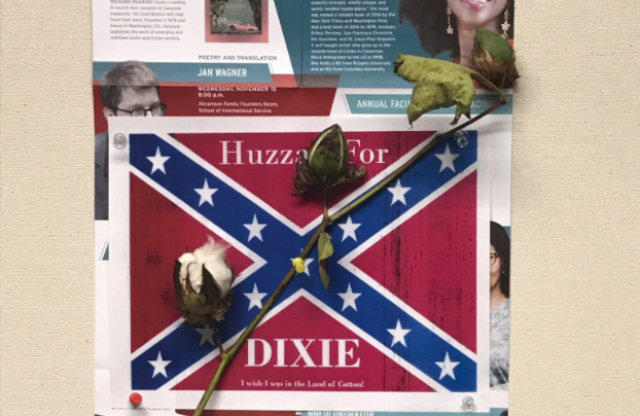 American University’s Department of Public Safety has released images and footage of a man who was seen on security cameras putting the posters up. The fliers—which read “Huzzah for Dixie”—were found hanging on message boards in at least three different campus buildings.