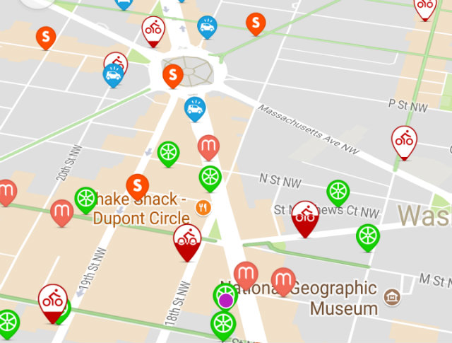 Transit, an app that links commuters to nearby transportation options like Metrobus, Metrorail, and car-sharing, has added all four new dockless companies to its map for D.C. (Capital Bikeshare docks were already included).