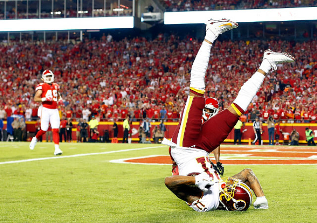 Terrelle Pryor catches a pass in the end zone for a touchdown during the game against the Chiefs on October 2. (Photo by Jamie Squire/Getty Images)