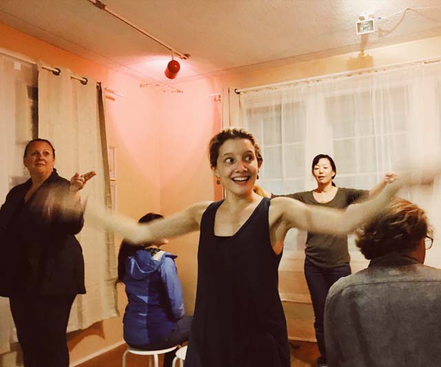 Wyckham Avery, Emily Sucher, and Momo Nakamura in rehearsal. (Jennifer Knight)
