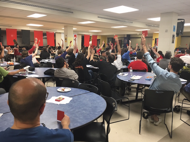 Attendees at the Metro D.C. DSA convention vote on a measure. (Photo by Rachel Kurzius)