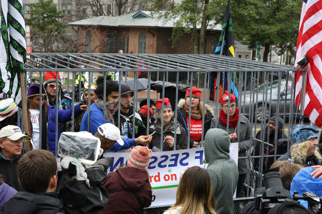 DCMJ handed out free marijuana from a jail cell on Inauguration day. (Photo by Benjamin Strahs)