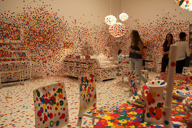 In addition to the Kusama exhibit, crowds have flocked to the Brutalist doughnut to see Ragnar Kjartansson’s Woman in E and meditative video works, Ai Weiwei’s provocative and hilarious Trace (which is still on view), and a summer-long exhibition of Yoko Ono’s work (50,000 people added handwritten notes to one piece).