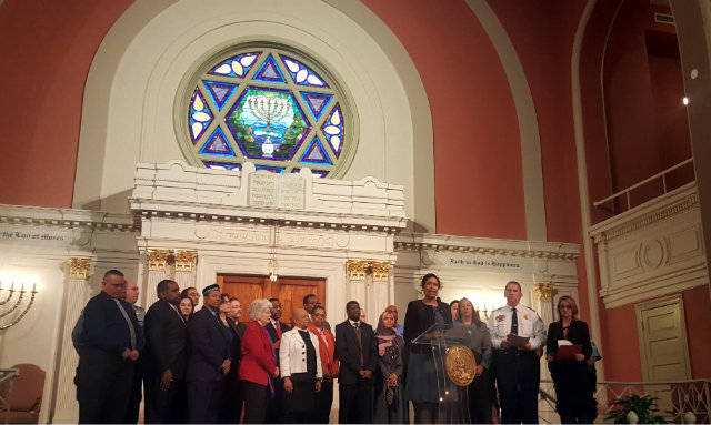 Mayor Muriel Bowser and MPD Chief Peter Newsham announced an uptick in hate crimes earlier this year at the 6th and I Synagogue. (Photo by Rachel Sadon)