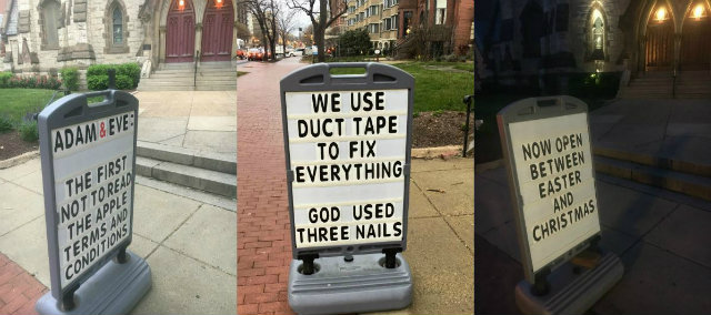 “Adam and Eve: The First Not To Read The Apple Terms And Conditions,” read one side of the church sign in front of the prominent house of worship by Thomas Circle recently.
