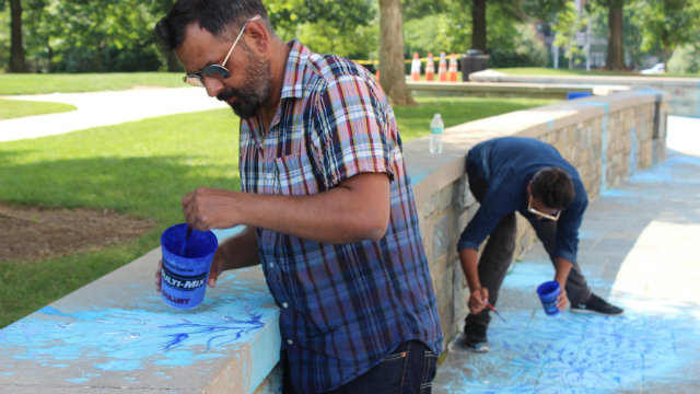 “I always try to create a dialogue with the architectural space and my painted vocabulary,” he said as he painted outside the Cathedral, just two days before the festival was scheduled to open on June 21. He and his assistant were rushing to finish in time – they’d been painting in the sun for the better part of a week and a half, and the humidity in D.C. was hovering around 70 percent. The first half of the process had been made significantly more challenging by the fact that Qureshi was fasting for Ramadan.