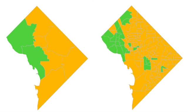 The breakdown of who voted for Initiative 77 by ward and by precinct. Yellow areas voted in favor; green against. (Maps courtesy of the D.C. Board of Elections)