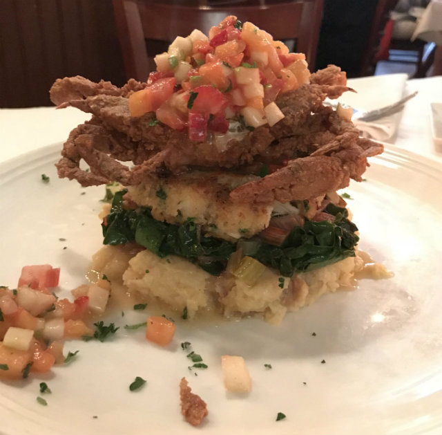 At Grillfish, the chef is serving soft shells two ways. There’s an appetizer ($18) tower that starts with a mashed-potato base, atop which sits spinach, then a crab cake, and finally the fried soft-shell crab itself, balancing a tiara of mango salsa. The entree ($37) is two fried or sauteed crabs, served with rice pilaf, asparagus, and greens, with tomato beurre blanc.