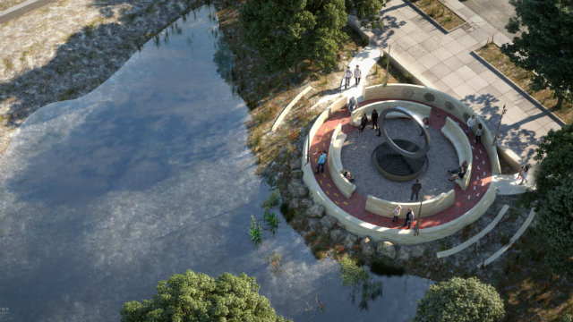 The memorial is scheduled to break ground next September and open in late 2020. It will center around a stone fountain shaped like a drum, with a large stainless steel circle rising from the center. Visitors will be able to tie prayer clothes onto the four lances that will rise from a circular path around the drum.