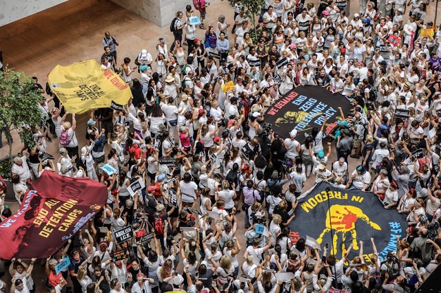 Original: Hundreds of women marched two miles down Pennsylvania Avenue to protest the Trump Administration’s family detention and separation policies, and demand the abolishment of Immigration and Customs Enforcement. The walk ended in the Hart Senate building, where hundreds risk arrest in an act of civil disobedience and Capitol Police has begun arresting them.