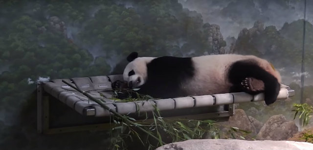 Bei Bei was munching on some bamboo in the yard when keepers replaced his old hammock with the new, larger version. It took less than a day to get used to the new furniture.