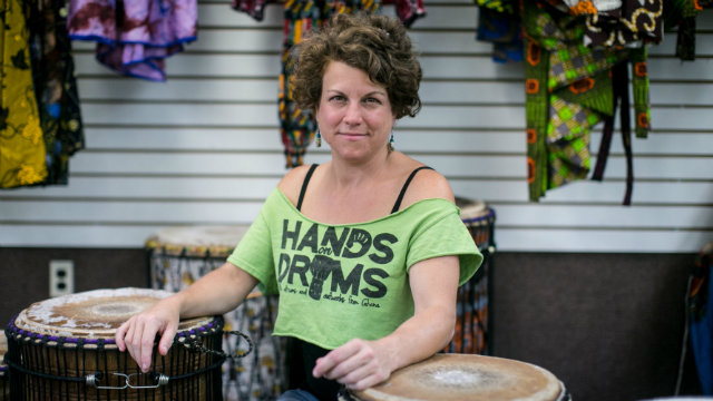 Kristen Arant calls herself “the drum lady.” She runs various programs, including the Young Women’s Drumming Empowerment Project, out of Hands on Drums. But the future of those programs will be in doubt when the space closes in August. (Photo by Becky Harlan / WAMU)