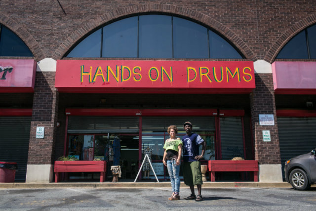 Kristen Arant and her husband Michael Kweku Owusu co-founded Hands On Drums, which is currently occupying a temporary space in the Rhode Island Avenue Shopping Center. (Photo by Becky Harlan / WAMU)