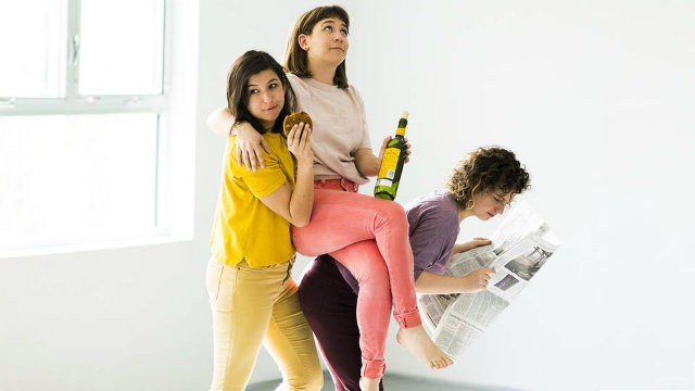 Aptly described as a “casually tender comedy-drama-dance,” Holon! is the creation of Area Woman, a trio of D.C.-based female performers: Claire Alrich, Sarah Greenbaum, and Sadie Leigh. They begin the intimately staged performance with a playful modern dance punctuated with synchronized yoga-esque breaths and set to Meg Lowey’s live layering of voice, beatboxing, and harmonium chords.