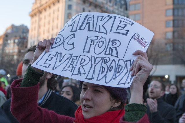 A protest in front of the Wilson Building in January 2017. (Photo by Alex Edelman)