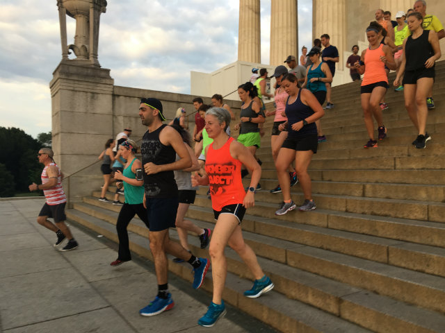 On Mondays the D.C. chapter meets at 6:30 a.m. at Meridian Hill/Malcolm X park. On Wednesdays they meet at 5:25 a.m. or 6:20 a.m. at the Lincoln Memorial. On Friday the 6:30 a.m. meetup is at a new location every week, which leaders announce during Wednesday workouts, as well as on the chapter’s Facebook, Google calendar, and blog.