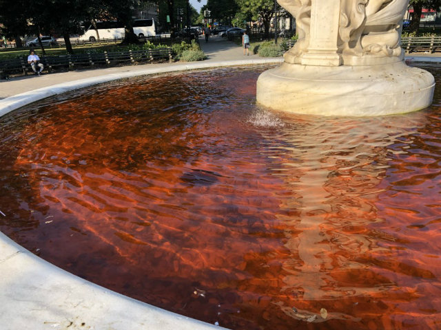 The crews found “some sort of powdered dye added to the water in the fountain,” says Hall. “The dye itself was a really weak dye, so it is almost filtered all the way out.”