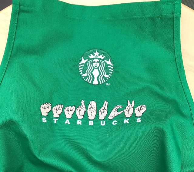 Deaf baristas will wear ASL aprons created by a deaf supplier, along with pins indicating they are fluent in ASL (Photo courtesy of Starbucks)