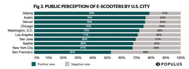 Populus argues that e-scooter services have less of a gender gap compared to bikeshares, and women have a slightly more favorable view of scooters than men (72 percent of total women surveyed versus 67 percent of men).