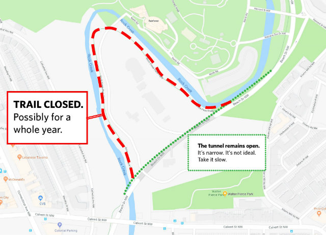 Attention cyclists, walkers, & runners: the Rock Creek Park path adjacent to the @NationalZoo is closed due to extreme deterioration from the recent flooding. @WABADC has put together the map below to show the closure and an alternate route. More info here:https://t.co/CsdM0Pakhq pic.twitter.com/VXmz4KU0tD
