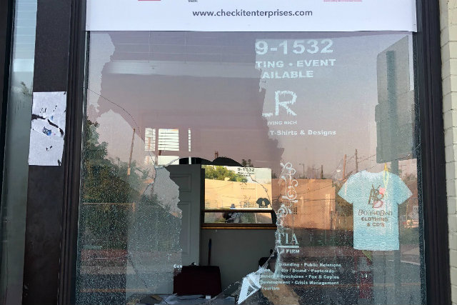 The smashed window at Check It. (Photo courtesy of Check It)