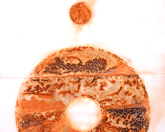“Rust used to be my nemesis as a welder,” explains artist Brian Kirk. But where that process interfered with his work as a sculptor, it inspired his work as a printmaker. For these works, Kirk used an outdoor printing press to imprint keys, nails, or his own sculptures onto watercolor paper or linen, and the results have a warm, ghostly beauty.