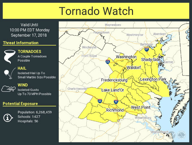 A #TornadoWatch has been issued from Richmond, VA to Washington, DC. brief Fast moving #tornadoes could be possible through tonight and push NE. Several tornado warnings are currently ongoing near Richmond. #vawx #florence pic.twitter.com/joPVR7126J