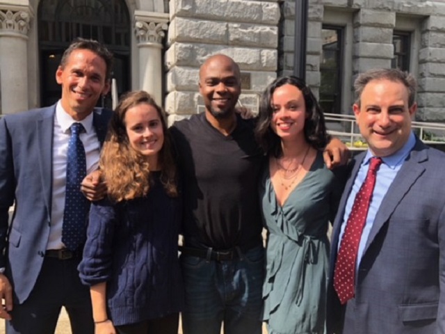 Georgetown professor Marc Howard, student Julie Fragonas, former inmate Valentino Dixon, Isobella Goonetillake, and Marty Tankleff standing in front of the Erie County, New York, courthouse after Dixon was released. (Courtesy of Georgetown University)