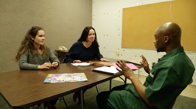 Georgetown University students Julie Fragonas and Isobella Goonetillake speak with Valentino Dixon at Wende Correctional Facility. (Photo Courtesy of Strong Island Films)