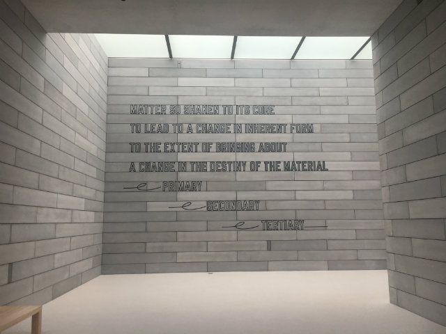 Lawrence Weiner’s “MATTER SO SHAKEN TO ITS CORE TO LEAD TO A CHANGE IN INHERENT FORM TO THE EXTENT OF BRINGING ABOUT A CHANGE IN THE DESTINY OF THE MATERIAL PRIMARY SECONDARY TERTIARY.” (Photo by Rachel Kurzius)