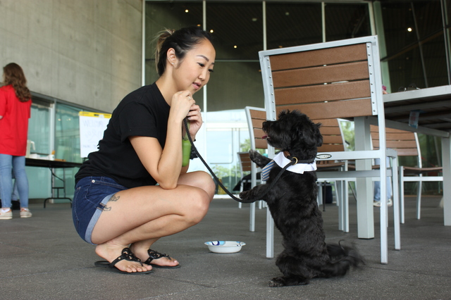 10:20 a.m.: It’s Rosie’s turn. Vazquez asks Watts and her daughter, Molly, about the 2-year-old dog’s special skills. “She can sit and she can twirl,” Watts says proudly. Rosie scurries off to sniff around a few times, but largely does well on the tests. Valm says she’s going to try a “quick rush up to her,” and runs up to the dog squealing “Rosieeeeee!” Rosie does not care for this, and runs behind the table. “She’s afraid of getting stepped on,” laments Molly Watts.