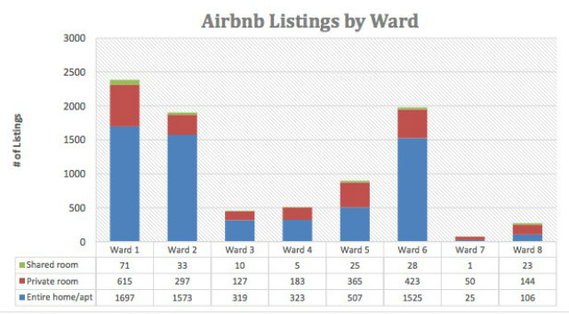 The overwhelming majority of Airbnb rentals are located in wards 1, 2 and 6, and are for entire homes or apartments. This data is from 2017. (Image courtesy of the D.C. Council)