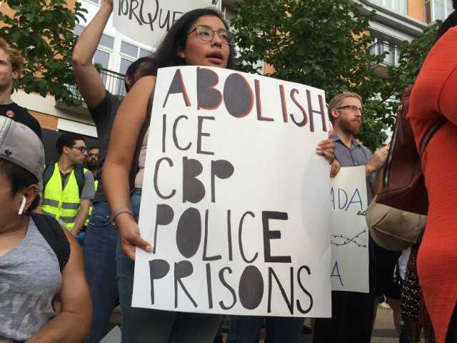 Protestors rally in Columbia Heights on July 17, 2018, as part of a protest against a series of arrests by U.S. Immigration and Customs Enforcement. (Photo by Elly Yu / WAMU)