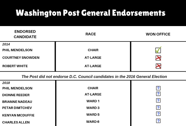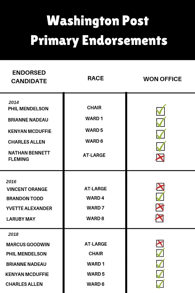 DCist went back to look at the editorial board’s track record in picking winning D.C. Council candidates over the last two election cycles, in both primaries and general elections (D.C. is such a heavily Democratic city that primary contests are often effectively the general election). It has a mixed record.