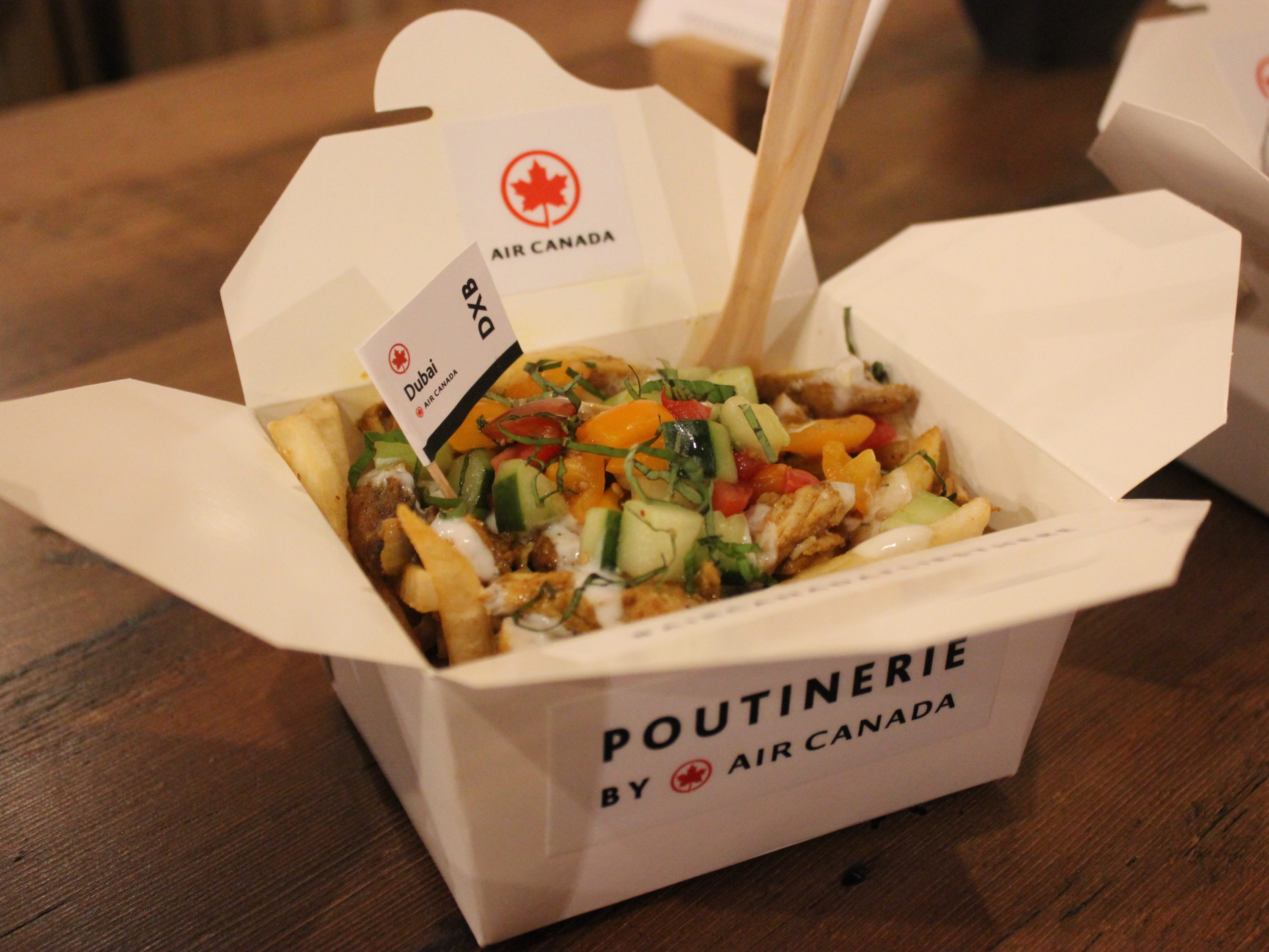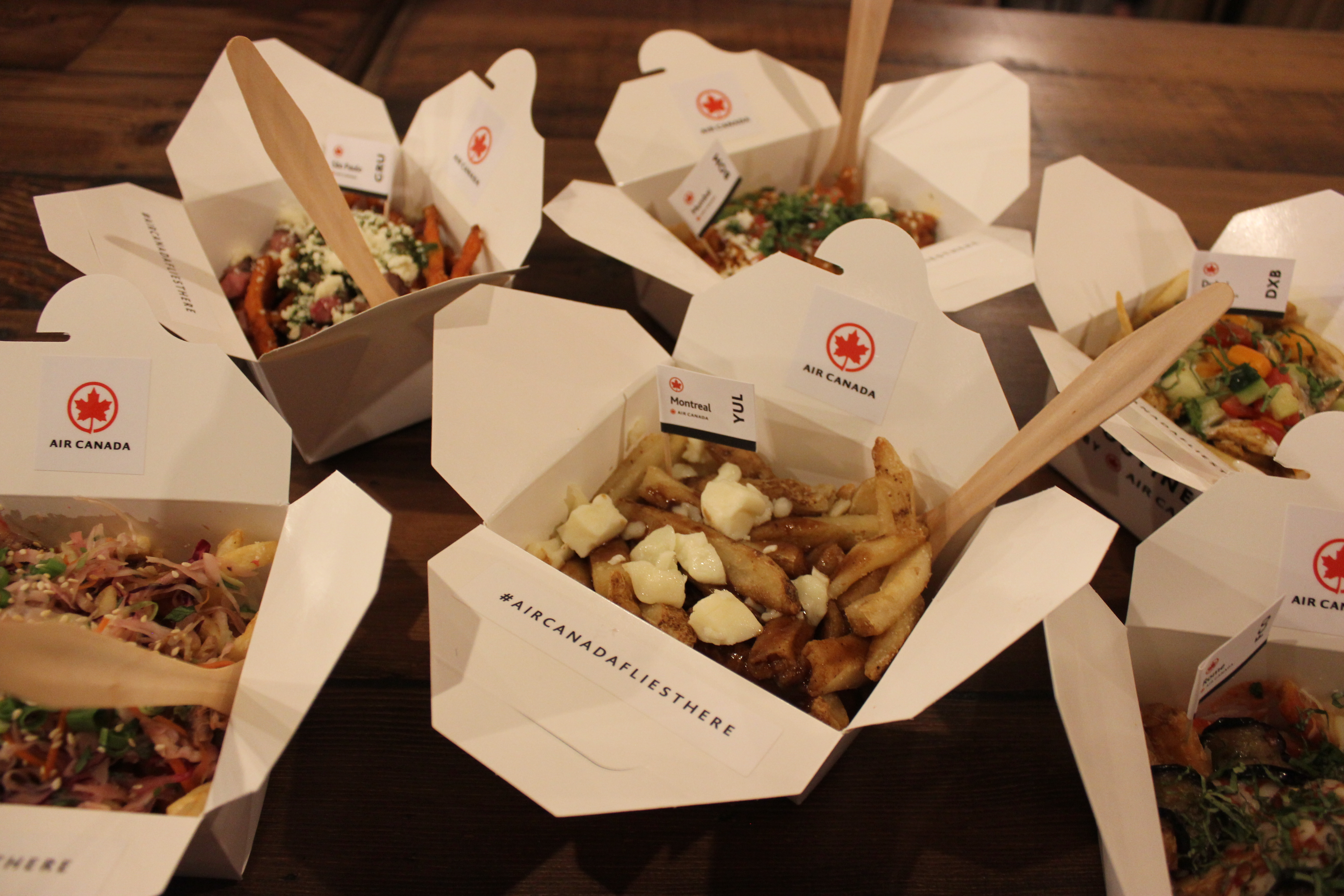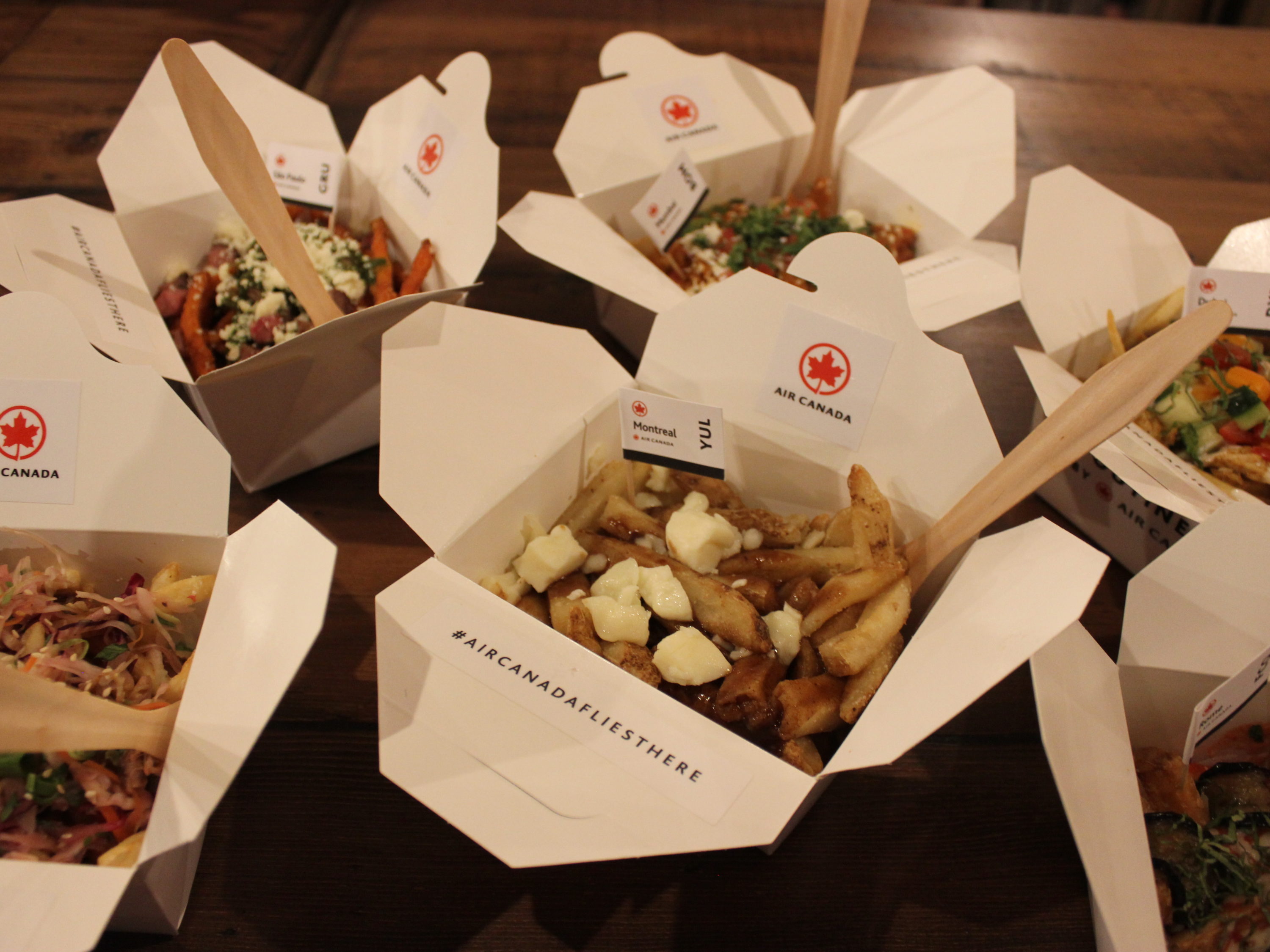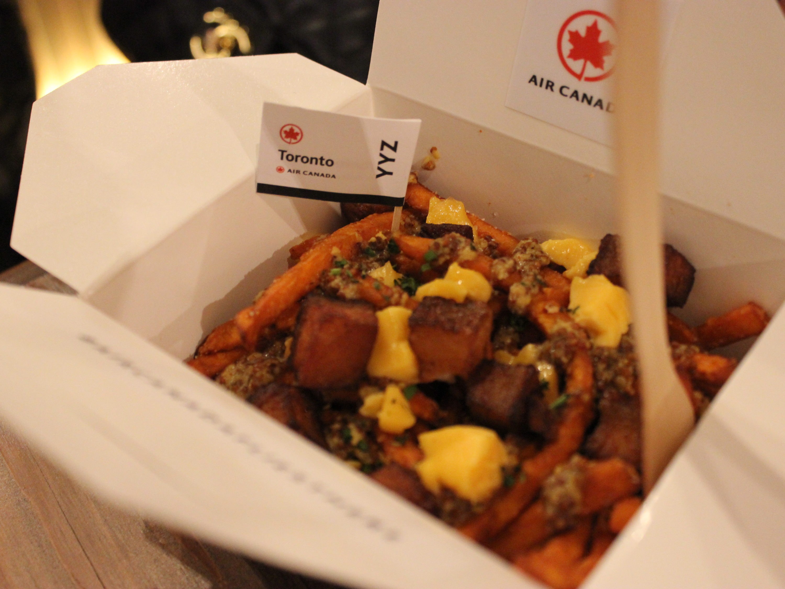 Sadly, Air Canada is not offering tiny bags of peanuts or neck pillows at the Poutinerie.