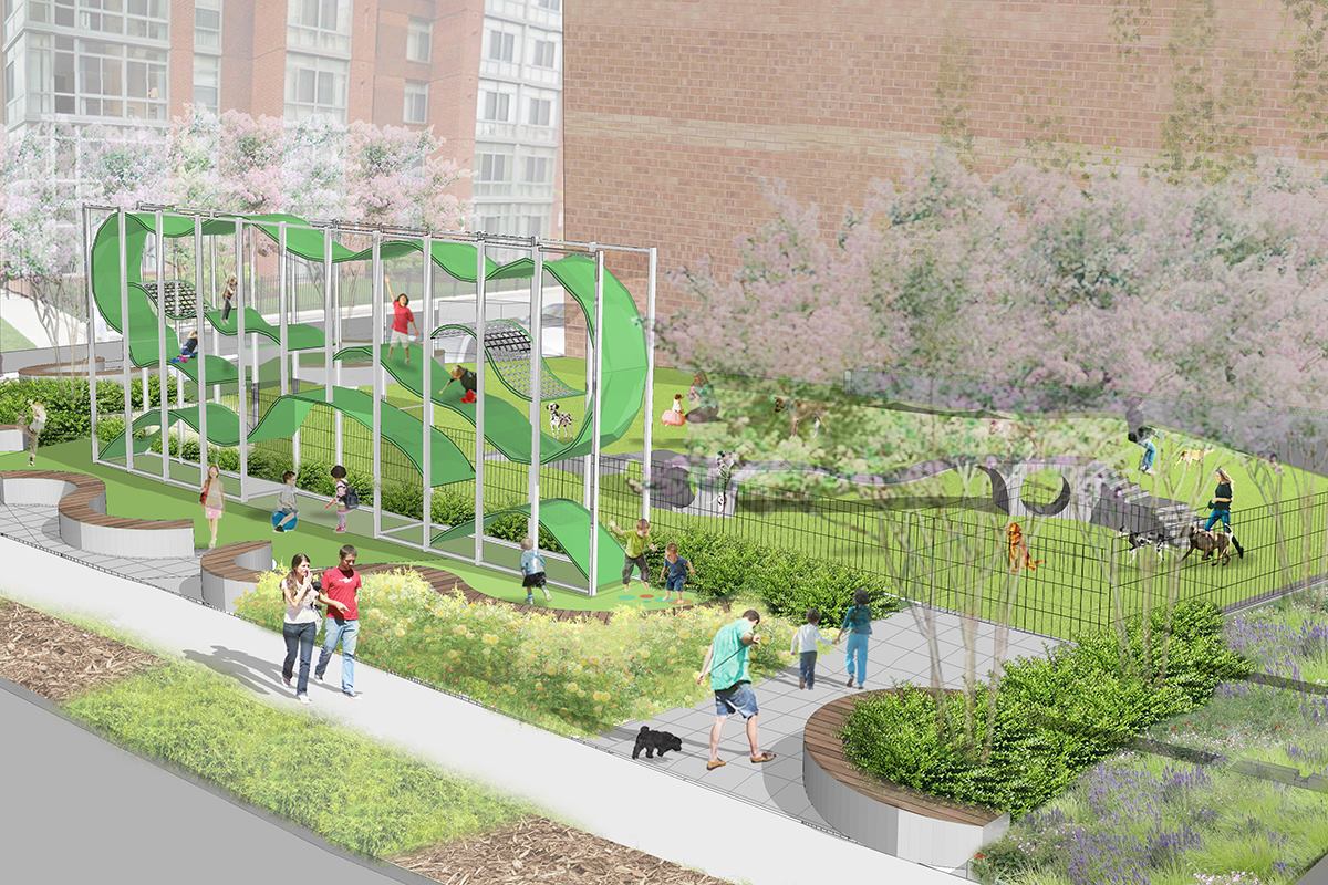 Swampoodle Park will feature the neighborhood’s first official dog park, benches, and a Wallholla—a vertical children’s playground. Local leaders will celebrate the grand opening on Saturday with an inaugural climb on the structure, followed by a dog procession.