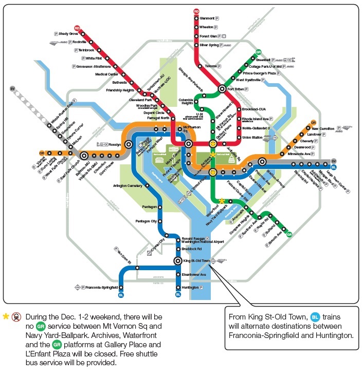 Another closure of note: On the weekend of December 1-2, Green Line stations at Archives, Waterfront, Gallery Place and L’Enfant Plaza will be closed.