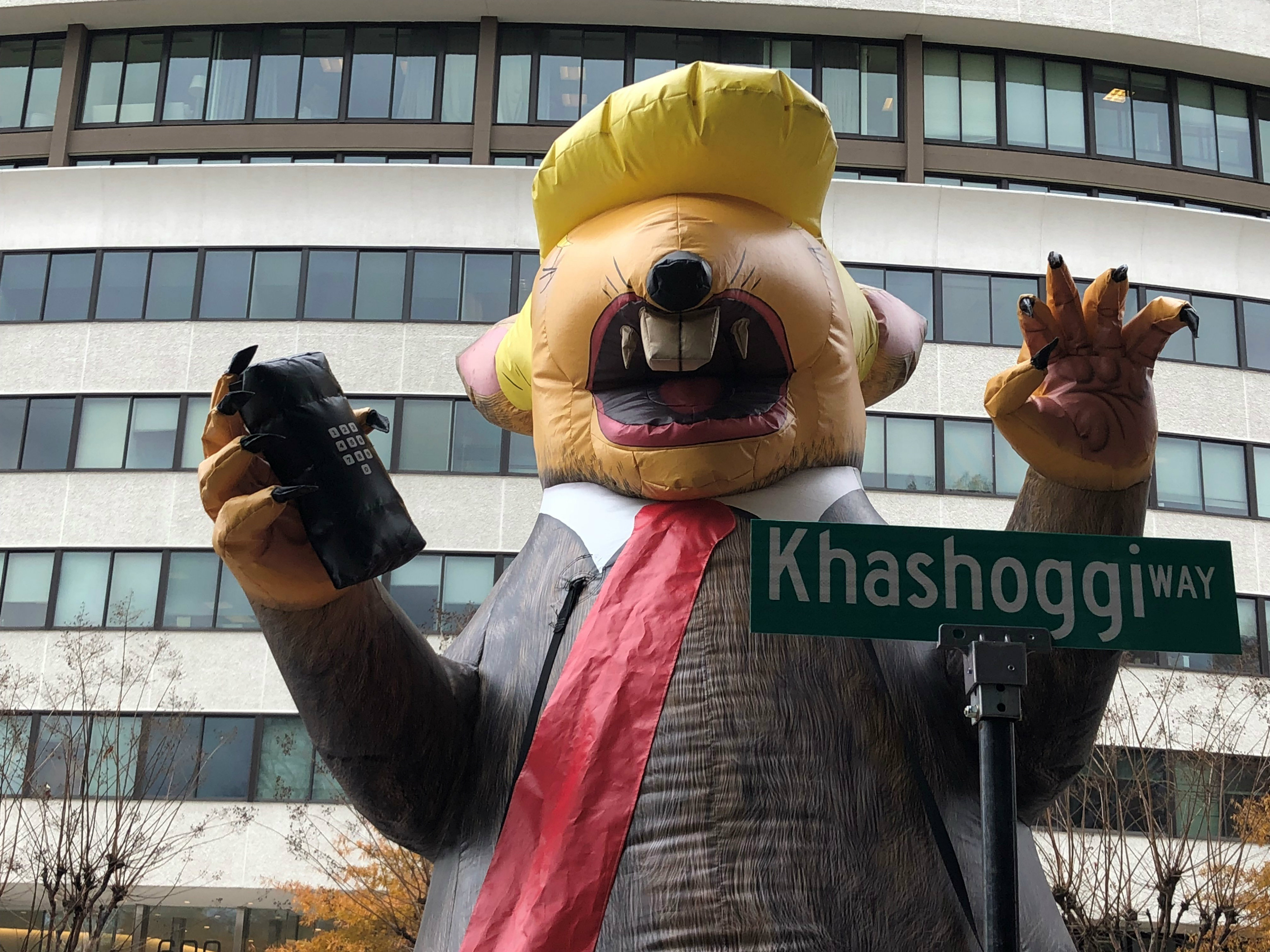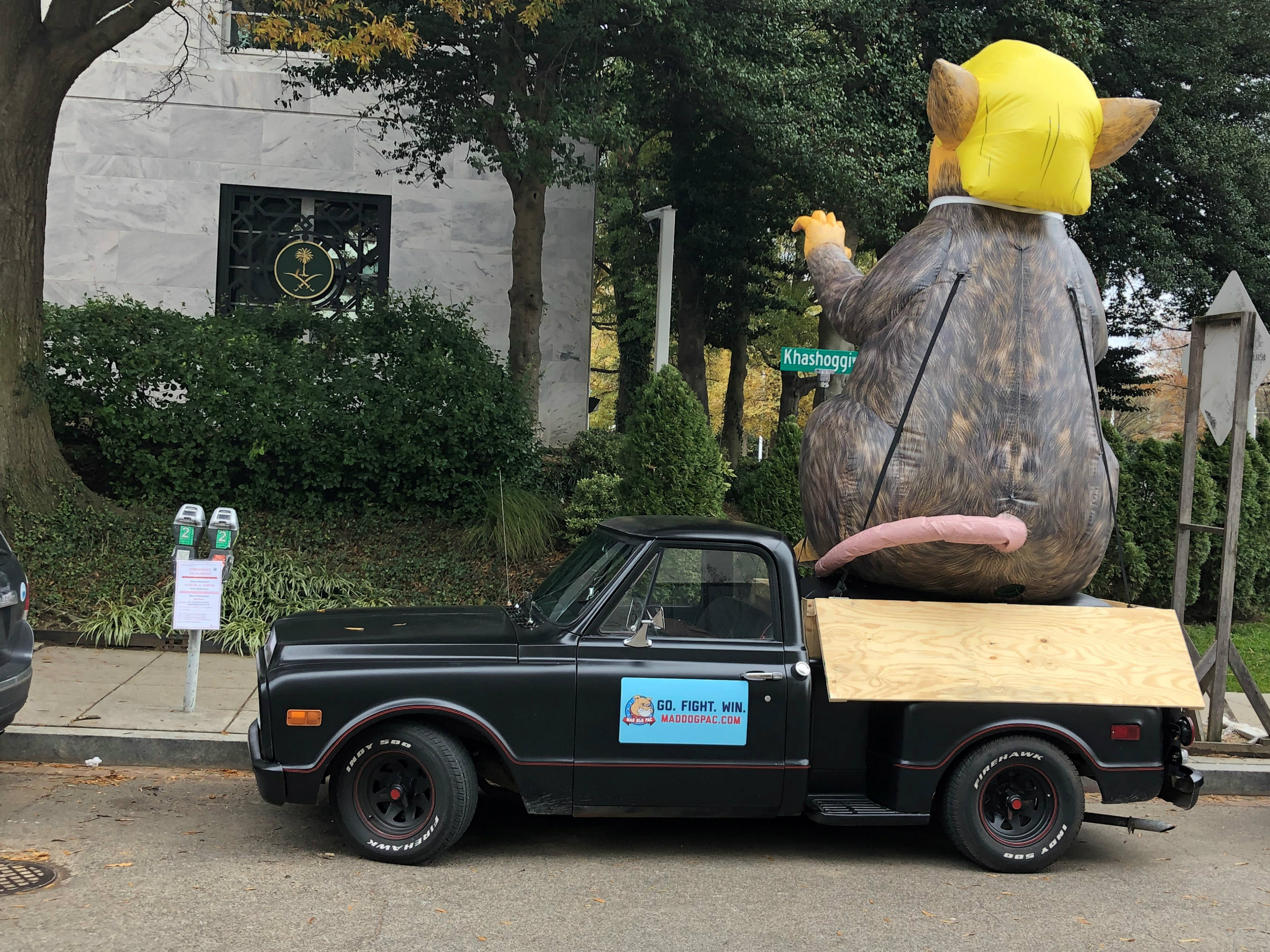 Taylor says Mad Dog PAC purchased a dozen of these “Khashoggi Way” signs for $280 total (there are additional costs to put up the signs with poles and cement blocks). He plans to put up the other 11 signs throughout D.C. “I would expect you might see some by the Old Post Office,” where the Trump International Hotel resides, because he says that “it’s definitely a fair call to associate this crime with Donald Trump.” Trump released a statement last month that said, despite the evidence against Saudi Arabia, the U.S. “intends to remain a steadfast partner of Saudi Arabia.”