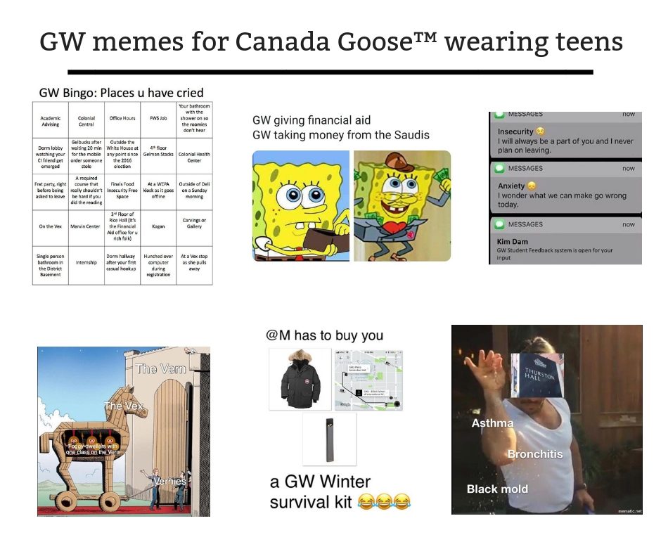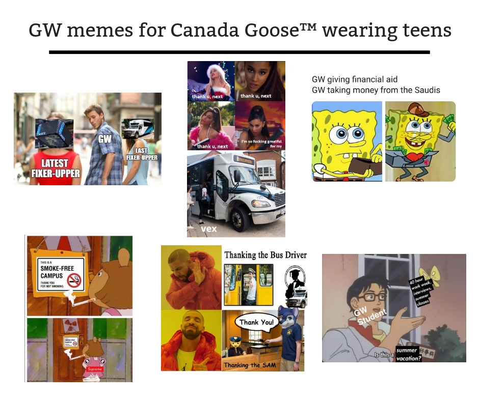 “GW memes for Canada Goose™ wearing teens” is the biggest university meme group in D.C., with more than 13,800 members. It recently posted the jealous girlfriend meme to highlight shoddy campus resources after issues with the Vern Express bus, or Vex, were closely followed by the the basketball stadium scoreboard collapsing. Living on a smoke-free campus, and the ups and downs of being in the center of D.C. are other points of discussion. Another hot topic hit the scene in late October, when GWU was determined to be the top recipient of Saudi Arabian money in the past six years.