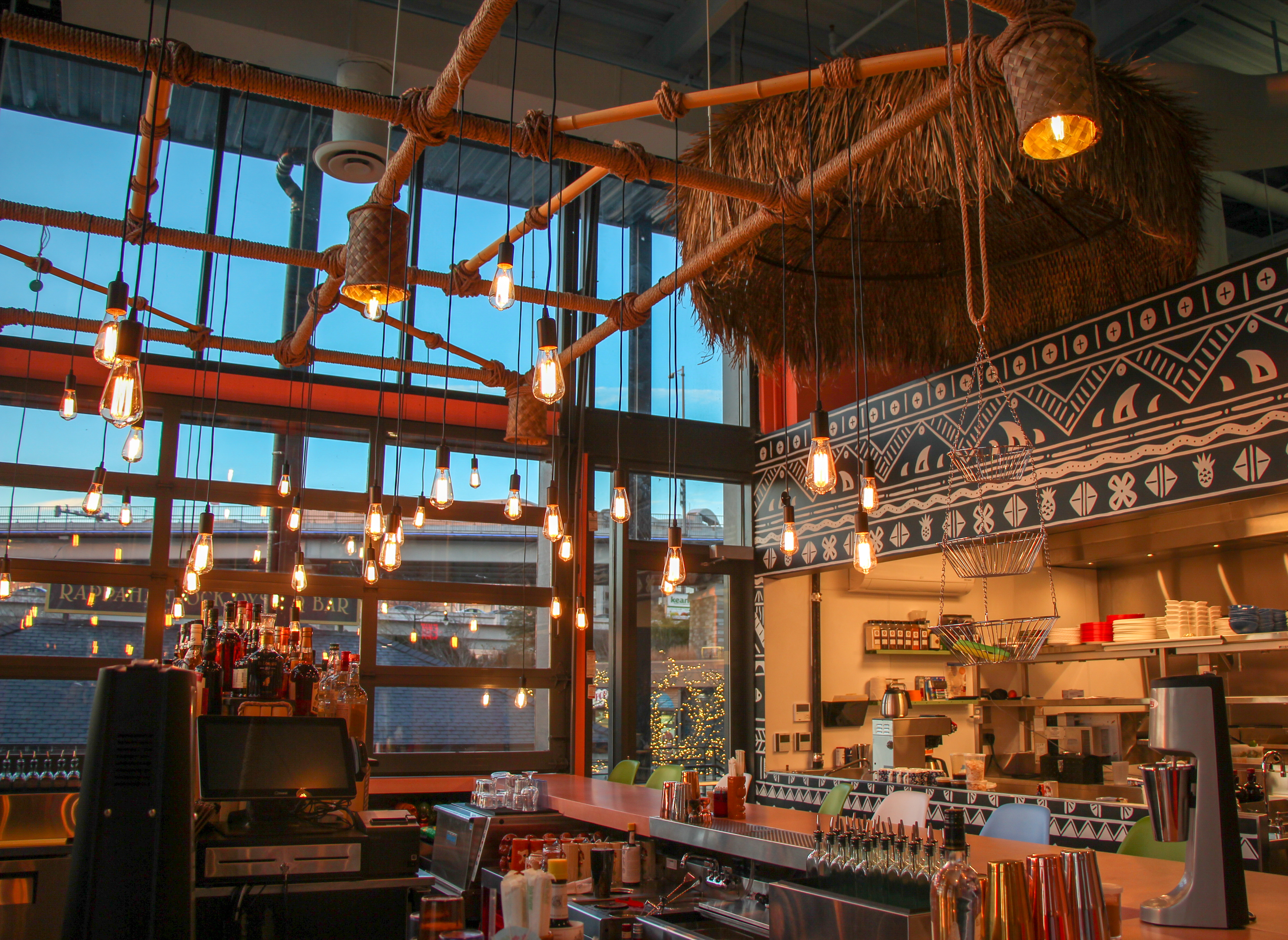 The menu, which is full of big-name chef collaborations from Thrasher’s industry friends, also doesn’t take itself too seriously: You can order bowls of kimchi Top Ramen and a slate of catches from The Wharf’s fish market next door alongside a Peruvian rotisserie chicken created by Maketto’s Eric Bruner-Yang. Chef Larry Blevins of Society Fair will oversee small plates ($6) like avocado dip and poi with mashed taro root to large dishes (up to $24) like coconut shrimp flatbread, salmon and Old Bay sandwiches from chef Bryan Voltaggio, and a pork shoulder platter with Hawaiian rolls and dipping sauces.