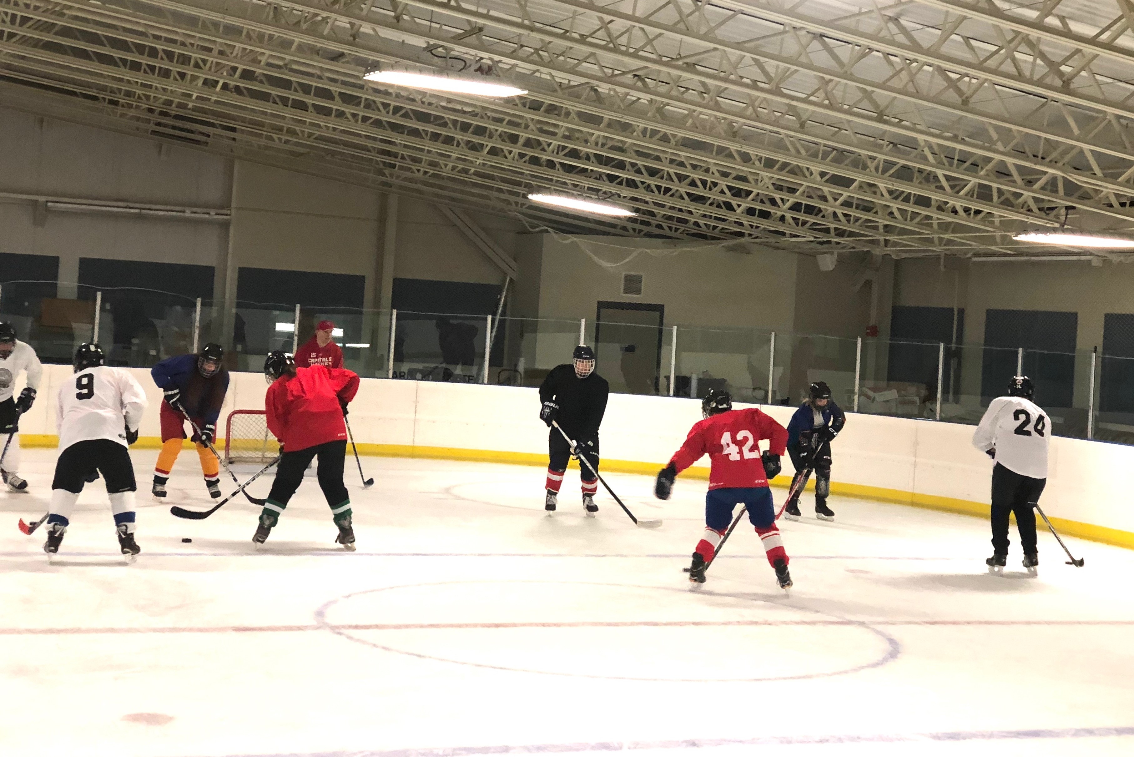 9:19 p.m.: Of course, as soon as I feel halfway decent at this skill, the instructors add a puck and I’m deflated again. We’re now supposed to practice skating backwards and passing at the same time. We get back in our pairs, with one person skating forward and one backward, passing the puck back and forth. Lo and behold, my partner and I are quite good at this drill, which makes it fun. Skating forward and backward slowly isn’t hard, and we figured out that if we make nice, easy passes at short range, we could keep the puck between us. But on our fourth go, we get too far away from each other and one of us makes a pass that’s out of reach. The puck slides clear across the ice and we lose it entirely.