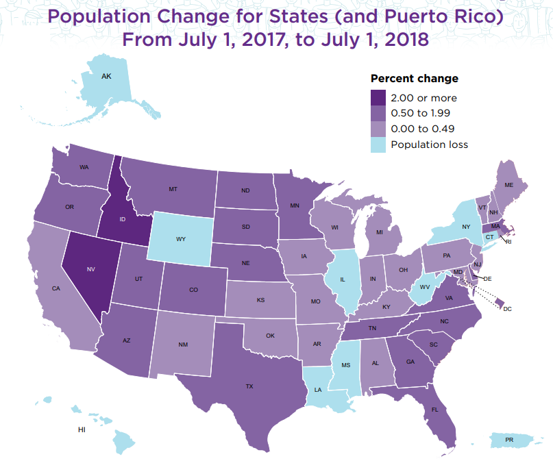 Around the country, Nevada and Arizona saw the largest relative increases—1.9 and 1.7 percent respectively—while Texas and Florida grew the most in terms of total numbers. Nine states and Puerto Rico saw declines.